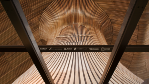 This design incorporates more than 400 glulam (glued-laminated) arches that extend up to 80 feet, paired with a lattice of Douglas Fir inspired by traditional regional weaving patterns. The roof provides structural support and creates a warm, biophilic atmosphere for travelers, reflecting Oregon’s natural beauty.